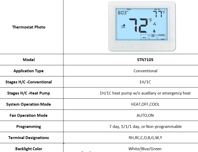 Le STN7105 sert de contrôleur de thermostat numérique polyvalent, compatible avec les systèmes de chauffage et de refroidissement conventionnels. Il prend en charge une configuration de pompe à chaleur 1H/1C sans chauffage auxiliaire ou d'urgence, ce qui en fait une option de thermostat de moteur efficace pour diverses configurations CVC.